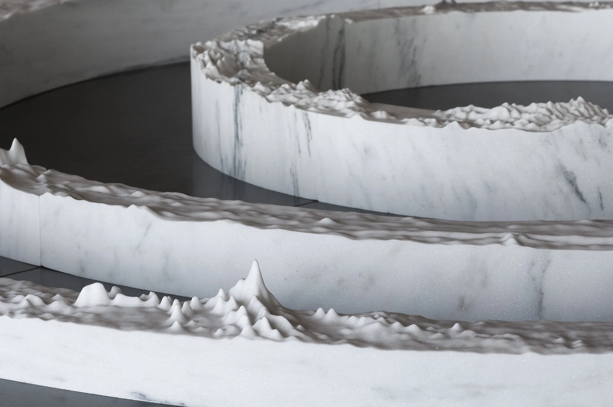 Pin River—Sandy was a massive geographical installation depicting the boundaries of Hurricane Sandy’s floodplain, composed of thousands of straight pins. I wanted to focus attention on water/land and works that gave people a sense of where they were. The new recycled silver work Bay, Pond, & Harbor depicting Accabonac Harbor, Georgica Pond, and Mecox Bay—related to the location of the museum on Long Island’s East End, was installed on the wall opposite Pin River—Sandy. Three marble sculptures, Arctic Circle, Latitude New York City, and Equator, representing the topographies at each of these positions on the globe, were installed in concentric rings on the museum’s floor, creating the new work Around the World x3.